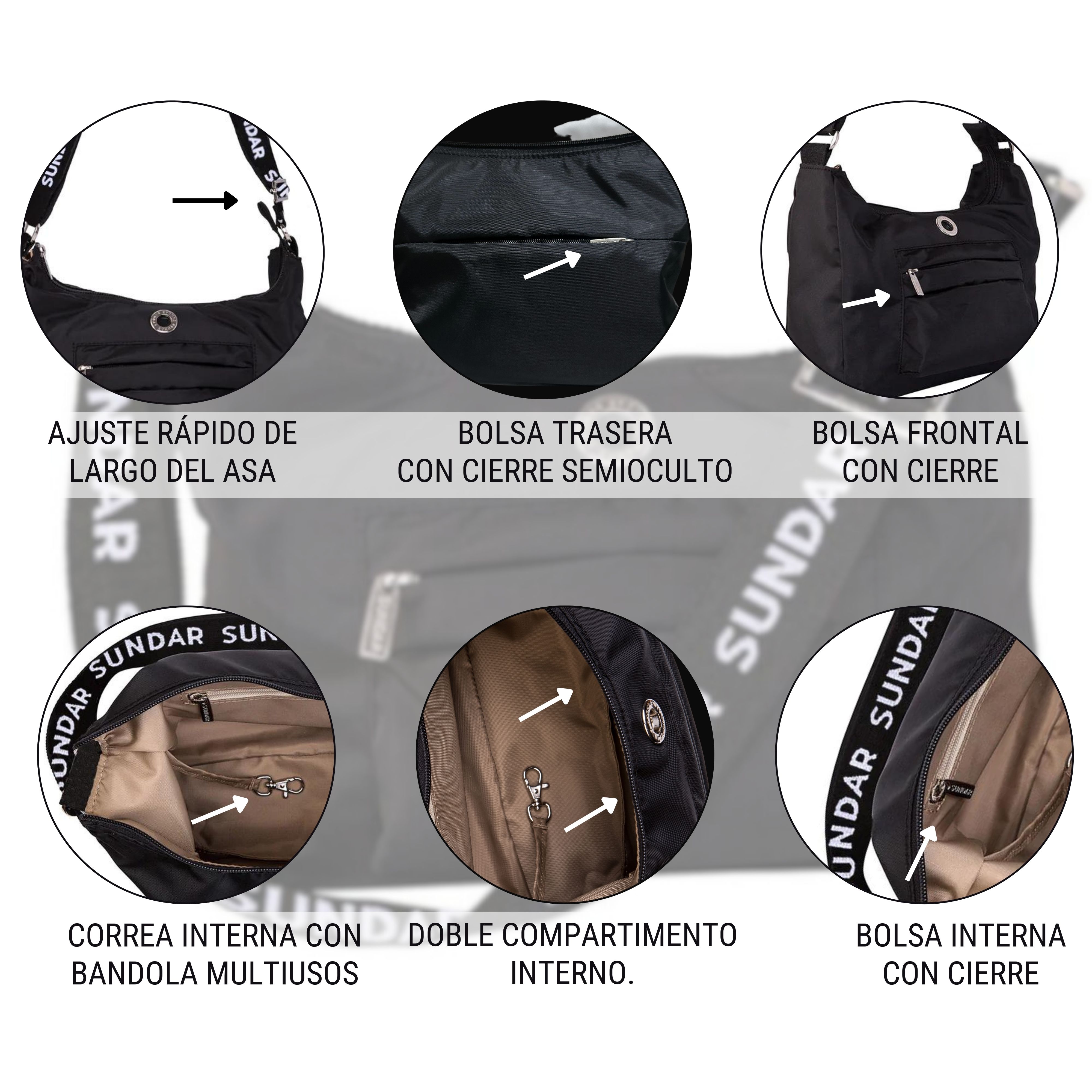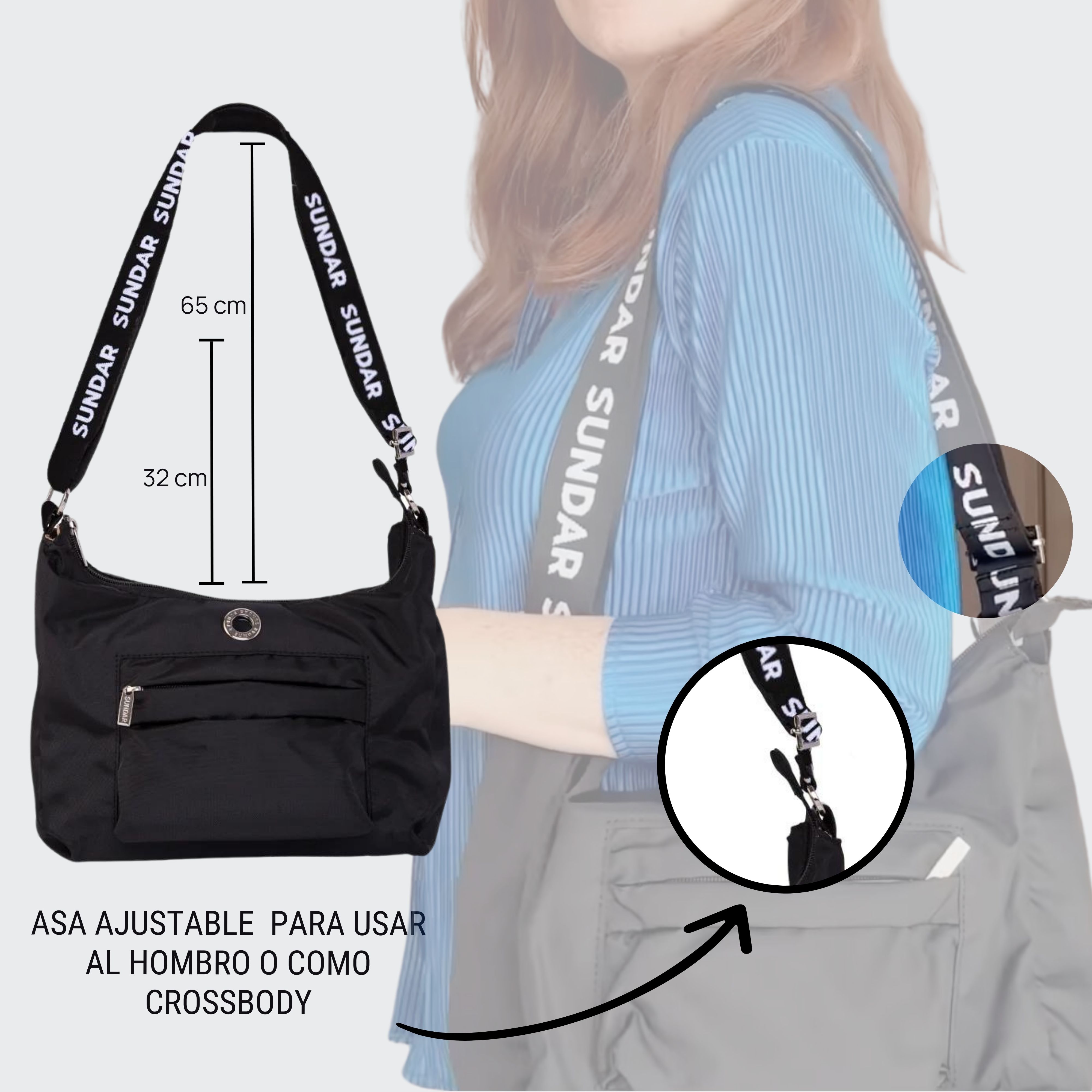 - Asa larga ajustable estilo crossbody con caída al hombro de 32 cm hasta 65 cm.